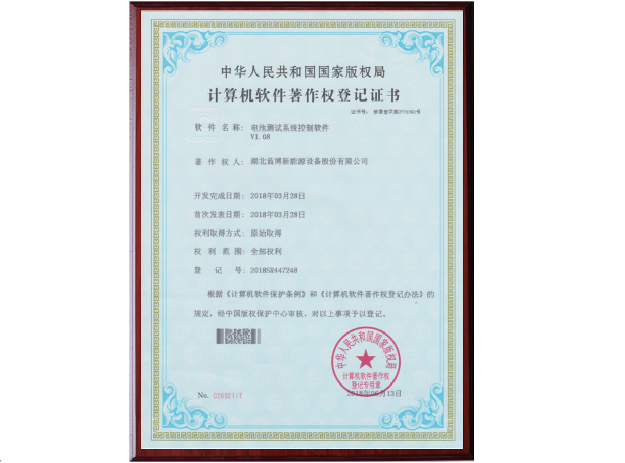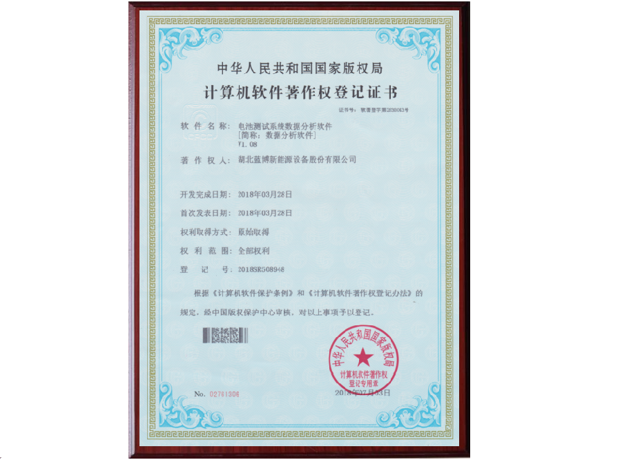 自2010年起,藍博公司技術市場團隊深入分析市場需求,定位研究目標和內(nèi)容,在產(chǎn)品線的協(xié)助下,合理組織公司資源,積極開展并高效完成藍博電池測試系統(tǒng)軟硬件的開發(fā),并于2013年5月、2018年1月、2018年2月向國家版權保護中心申報著作權,經(jīng)過三個多月的嚴格審核,最終正式獲得軟件著作權。